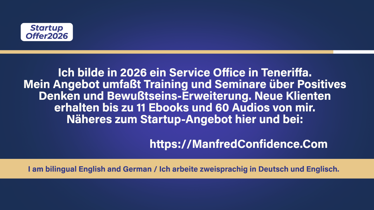 German/English Author, Speaker and Editor. Founder and Creator of ManfredConfidence.Com, PositiveCentrum.Com, PositiveSelfhelp.Info, PositiveWorldchange.Info, PositiveSpirituality,Info, PositiveArchive.Com and PositiveBoomers.International and TenerifeOffice.Info. Teaching, Training and Consulting Meetings in Europe, Online and in Tenerife, Canary Islands.